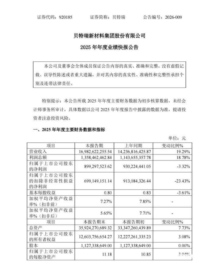 2月26日晚间,宇宙锂电负极材料龙头贝特瑞(920185.BJ)发布2025年年度事迹快报,公司全年终了交易收入169.83亿元,同比增长19.29%;包摄于上市公司股东的净利润8.99亿元,同比微降3.32%;扣除非时时性损益后的净利润6.99亿元,同比下滑23.43%。