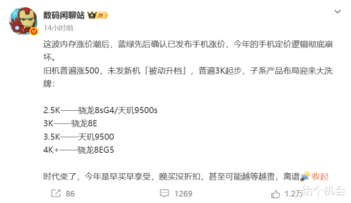 博主数码闲说念站暗示,这波内存加价潮后,手机订价逻辑透顶崩坏,尤其是子系家具更难抗,将会迎来大洗牌。