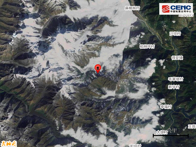 {jz:field.toptypename/}震中地形: 震中5公里范围内平均海拔约3942米。