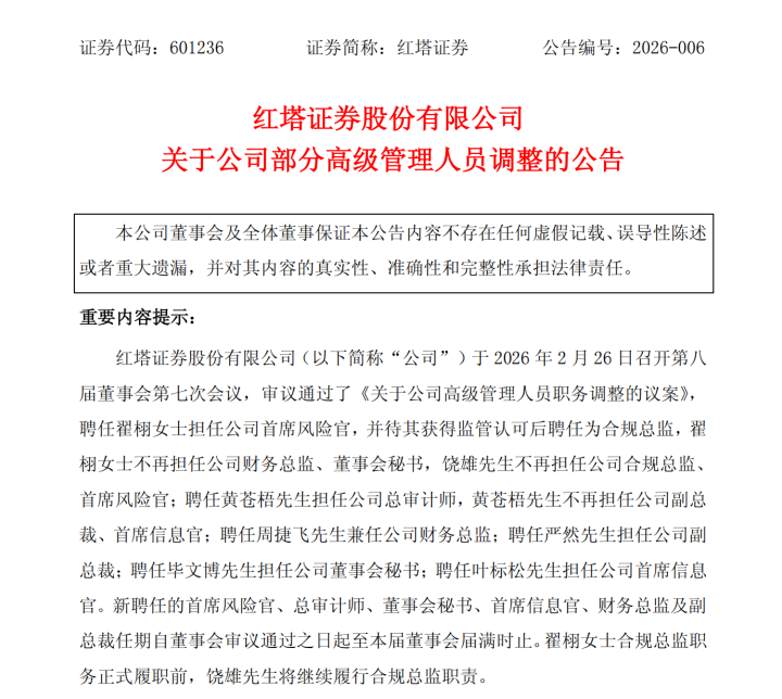 这次公告明确了具体任免安排,公司董事会遴聘翟栩担任公司首席风险官,并待取得监管招供后遴聘为合规总监,其不再担任公司财务总监、董事会布告,饶雄不再担任公司合规总监、首席风险官;遴聘黄苍梧担任公司总审计师,不再担任公司副总裁、首席信息官;遴聘周捷飞兼任公司财务总监;遴聘严然担任公司副总裁;遴聘毕文博担任公司董事会布告;遴聘叶标松担任公司首席信息官。