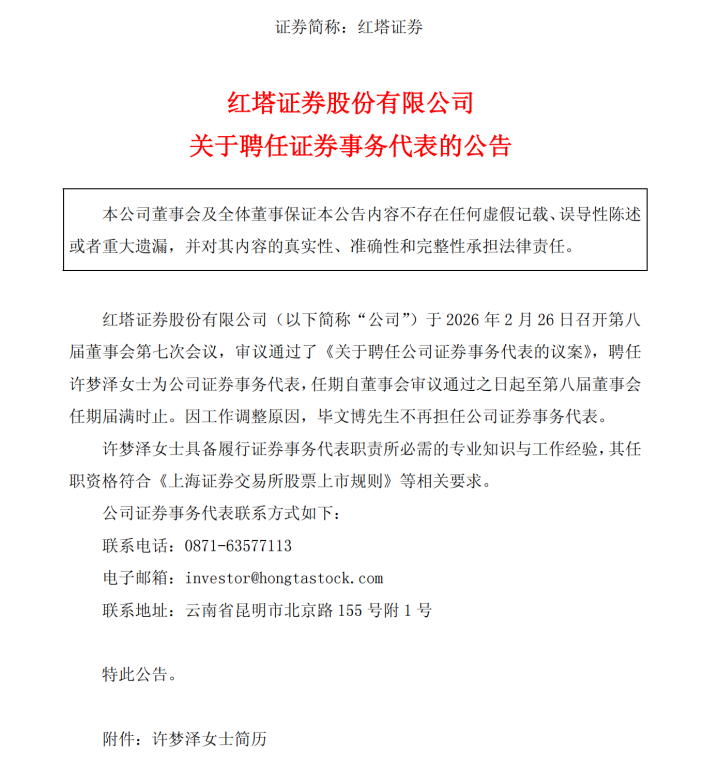 2月27日,红塔证券发布高档管制东谈主员职务转变公告,认真袒露了先前公开选聘责任的最终效果,中枢管制团队实现焕新扩容。同期,公司审议通过遴聘许梦泽担任公司证券事务代表,阅历袒露,2024年12月于今,许梦泽任红塔证券董事会办公室主任助理。