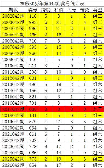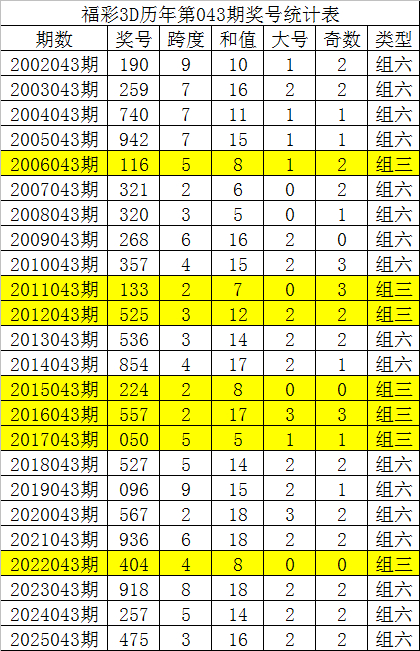 从以上统计不错看出,积年3D第043期开出了7次组三号码,开出了17次组六号码。组六号码出现概率大,本期预测开出组六号码。
