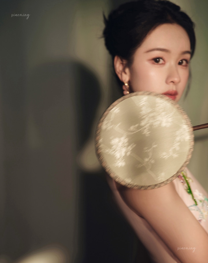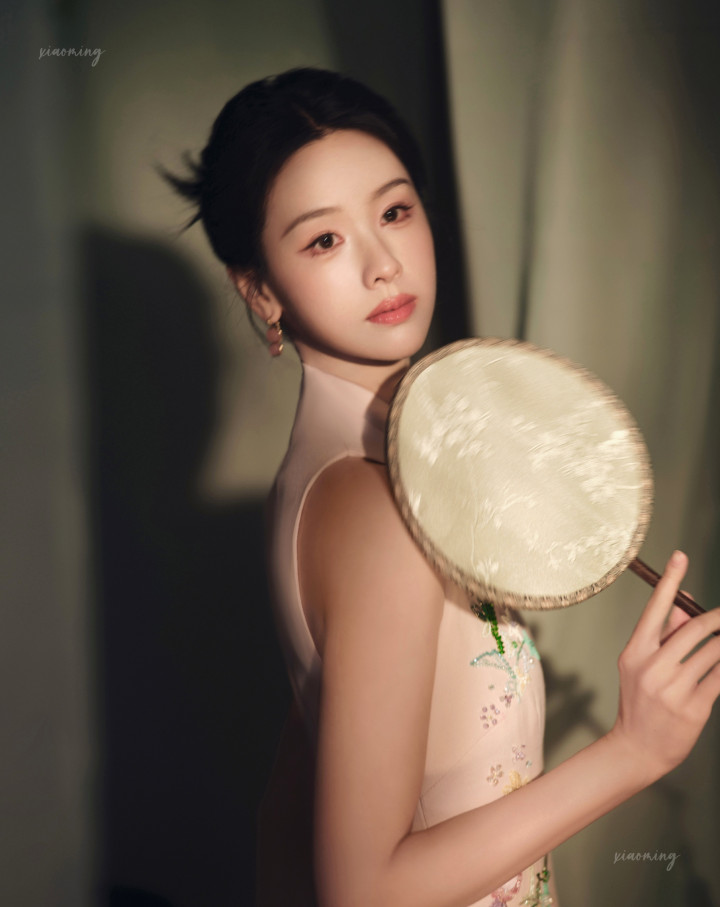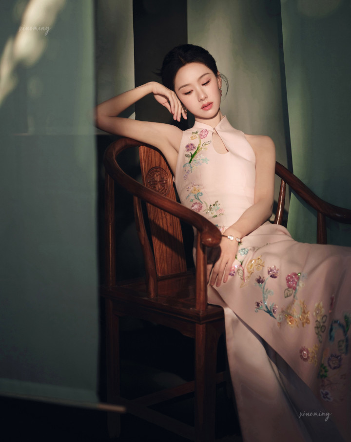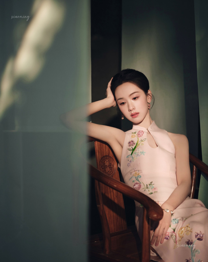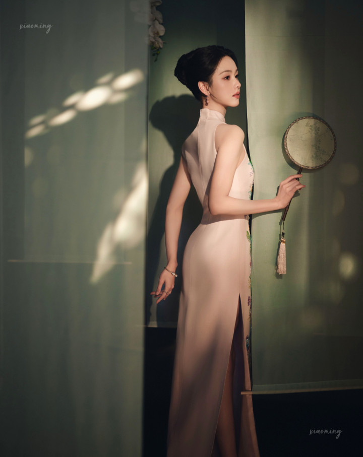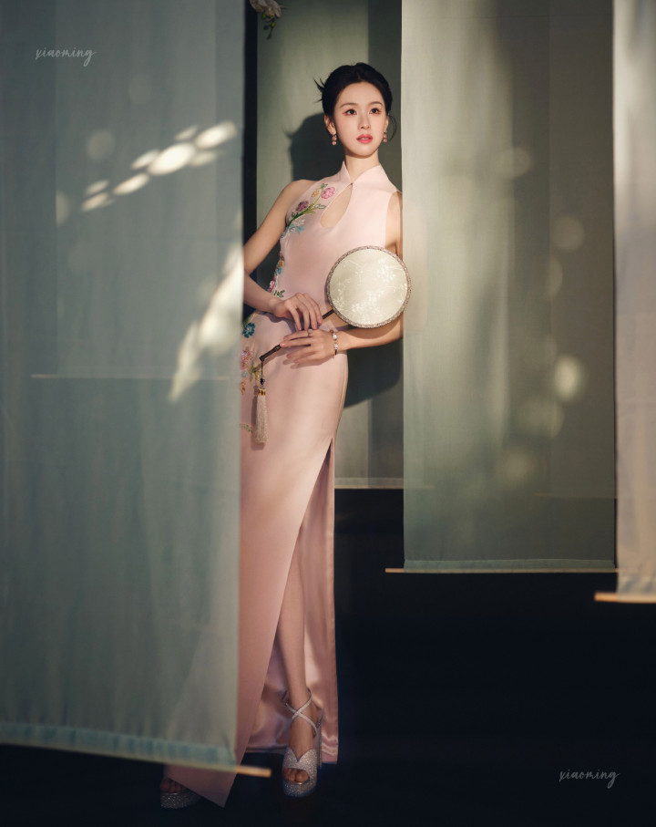 陈齐灵明明是传统旗袍的在意,偏巧水点镂空高开叉处藏着小性感