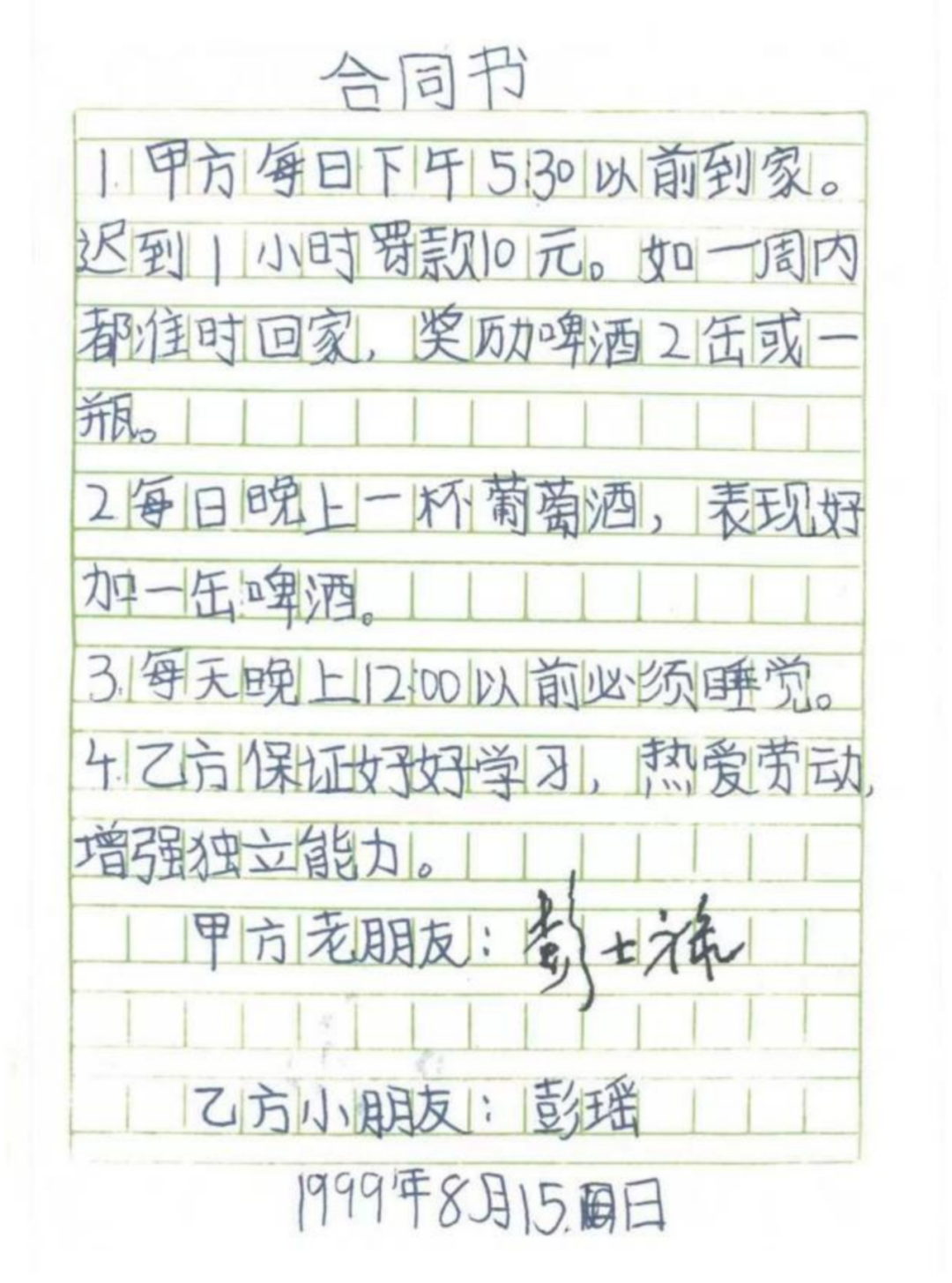 这份稀奇的“协议书”,甲方是“老一又友:彭士禄”,乙方是“小一又友:彭瑶”。