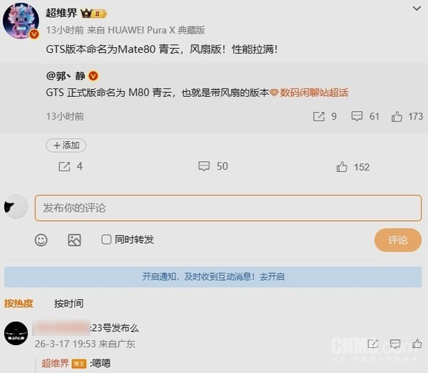 [CNMO科技音书]近日,罕有码博主称,华为此前外传中的“GTS”机型将被定名为“Mate80青云”,将自带散热电扇,“性能拉满”。该博主还说明,新机将在3月23日的发布会上亮相。