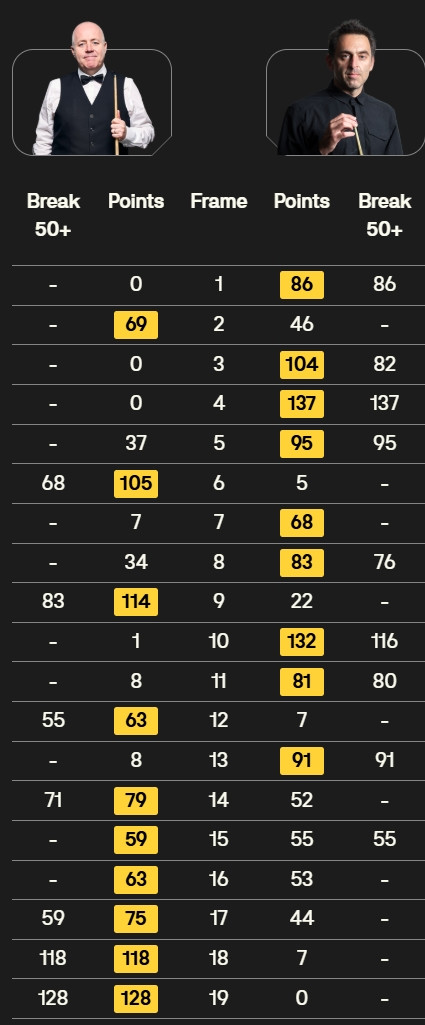 米兰 打出六连鞭! 希金斯第三阶段开局3连胜, 总比分10-9反超奥沙利文